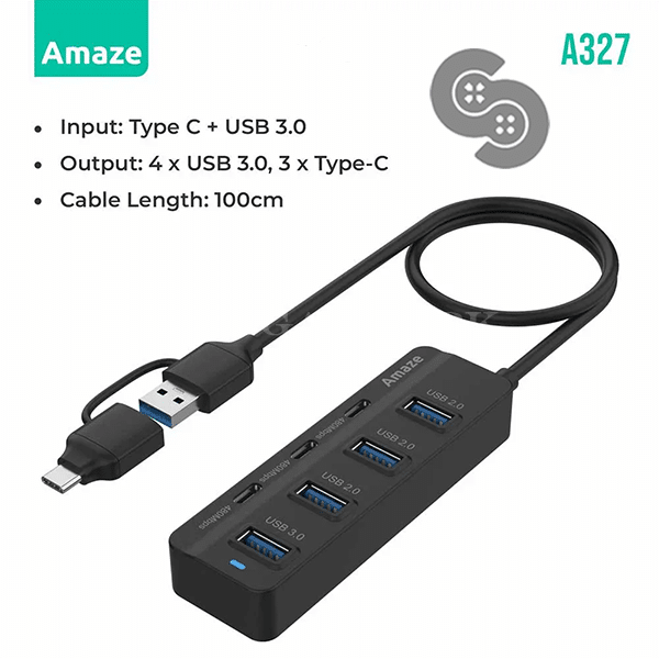 The Amaze Type C + USB 3.0 7 Port Hub – A327 is a sleek and versatile connectivity solution that expands your device’s ports with dual Type-C and USB 3.0 inputs, offering seven high-speed ports for seamless multitasking on laptops, PCs, tablets, and more.